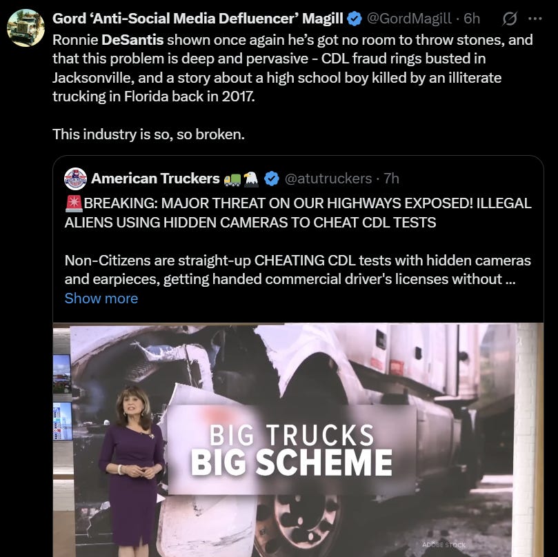This is a nationwide crisis of unqualified drivers, citizens and non-citizens alike. It’s bigger than the English language. It’s bigger than partisan theater. At the core, it’s about safety. And until we face that, the roads stay dangerous.