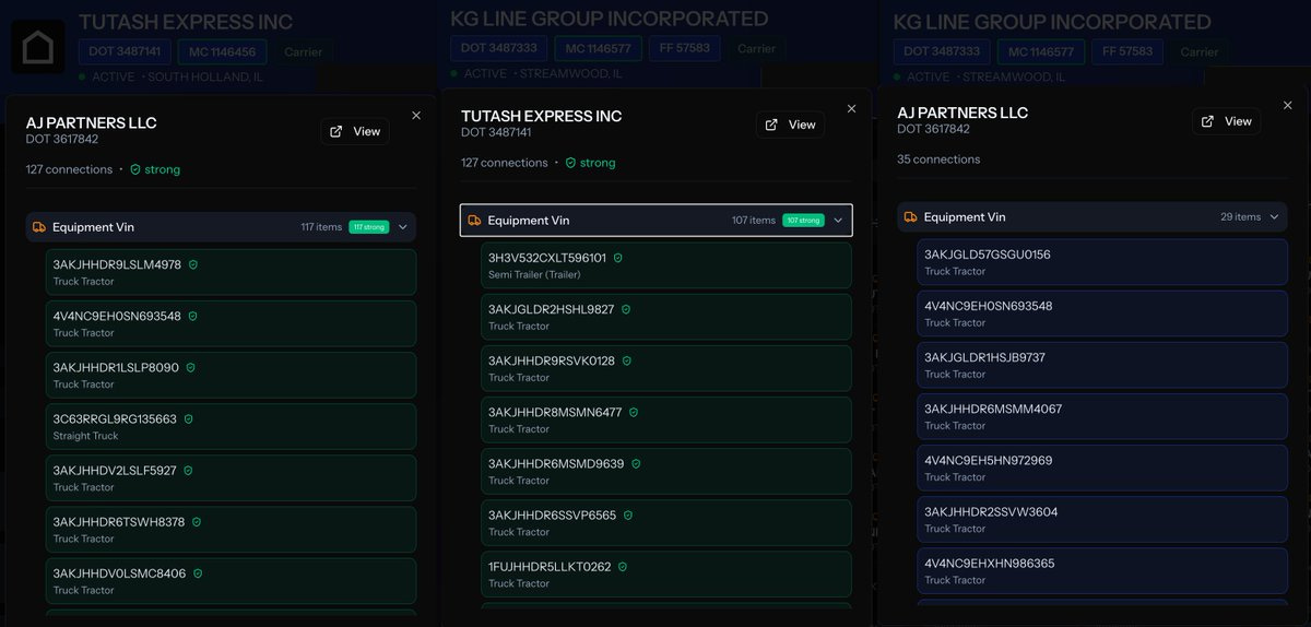 Immediately review all active and inactive authorities connected by shared VINs, officers, addresses, and equipment tied to this enterprise.
