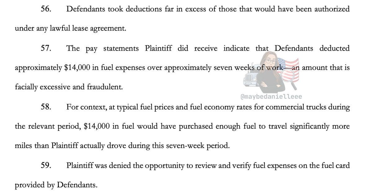One driverβs pay records showed roughly $14,000 in fuel deductions over about seven weeks. Based on mileage and fuel prices, this is theoretically impossible.